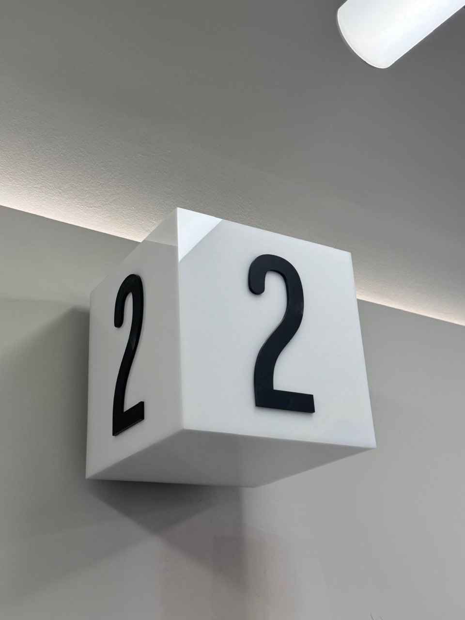 Fabricated and installed floor directional cubes, using opal acrylic and metal numbers.