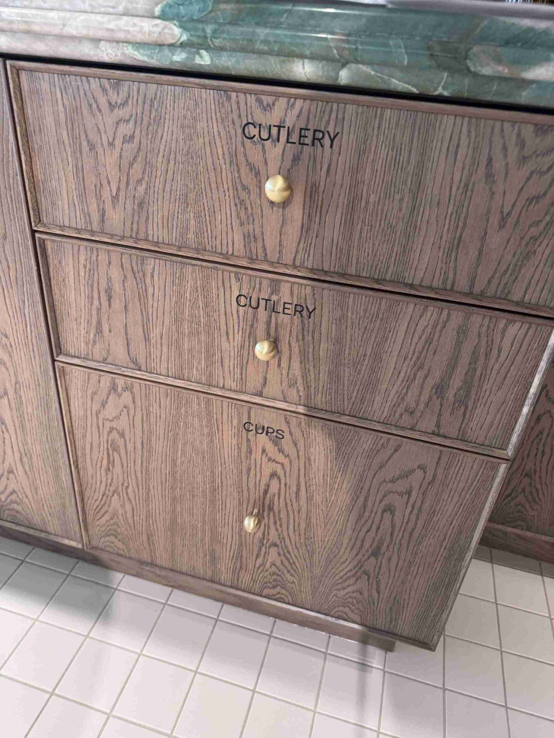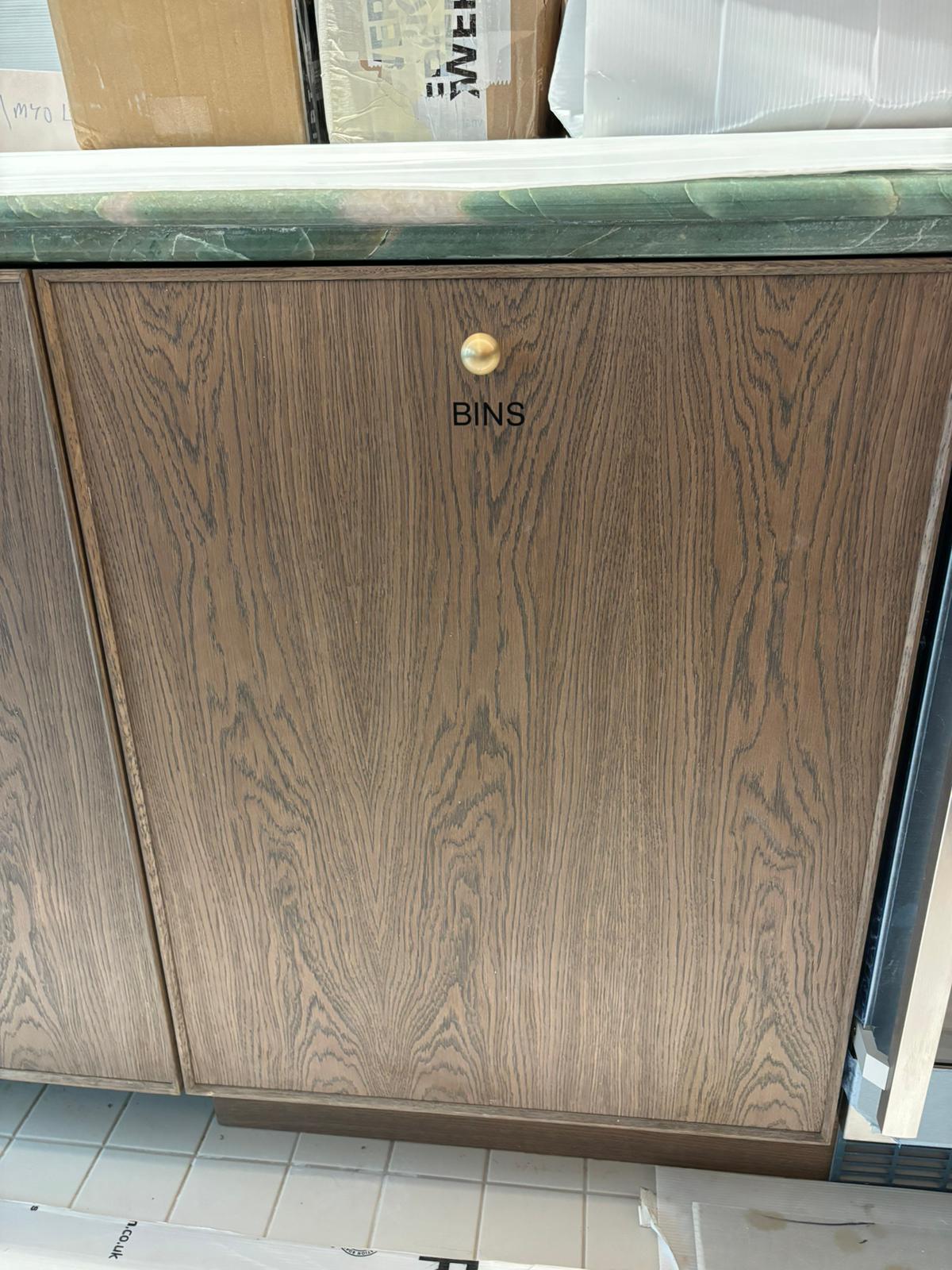 Installation of purple carpet tiles and textured laminate wrap for cabinets.