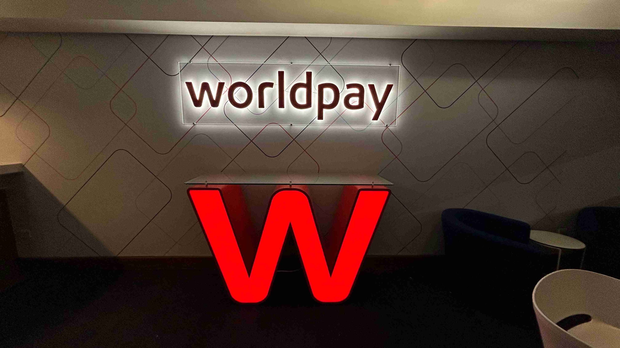Custom-made wall-mounted LED ‘WORLDPAY’ sign with cut acrylic detailing.