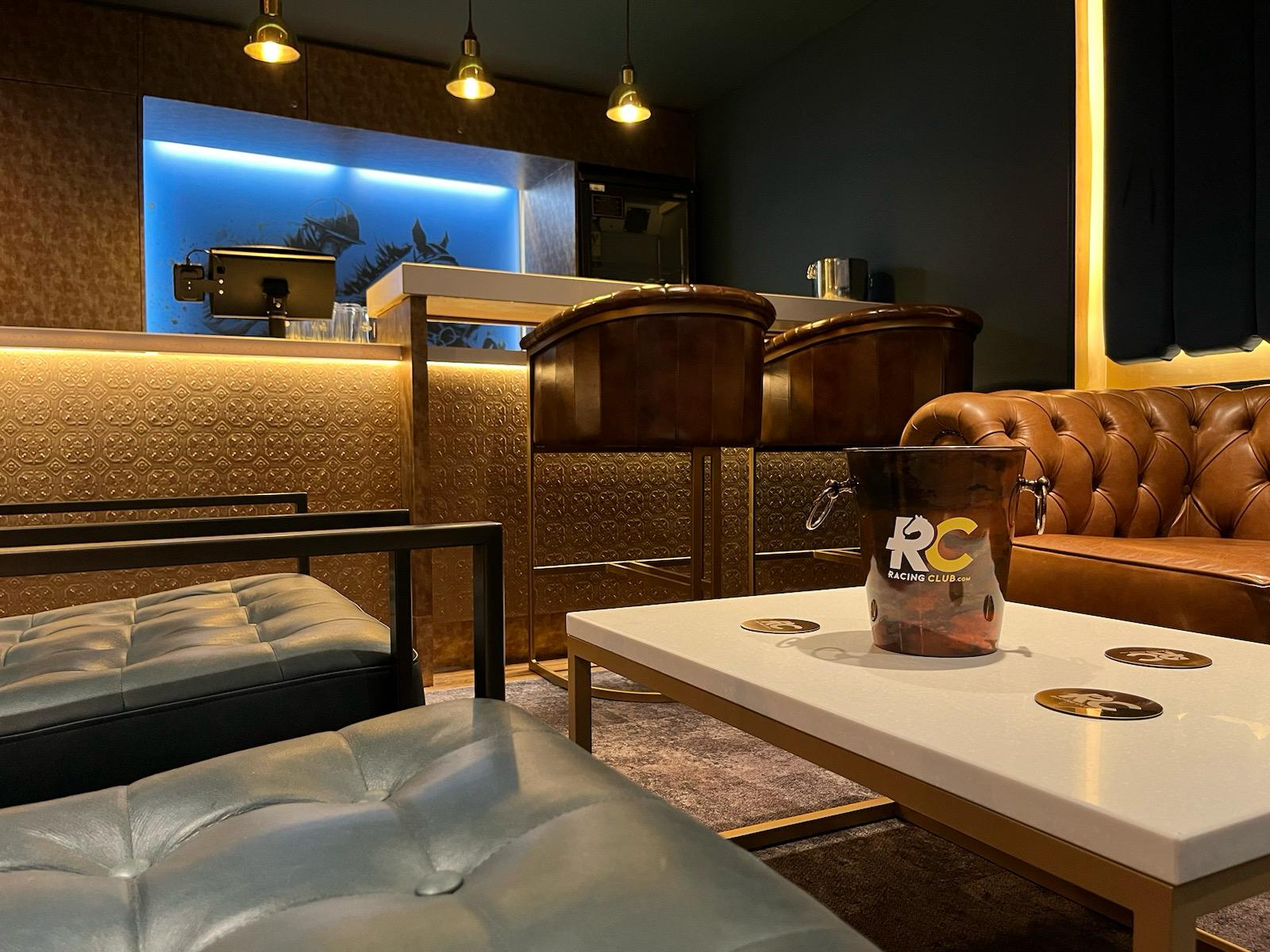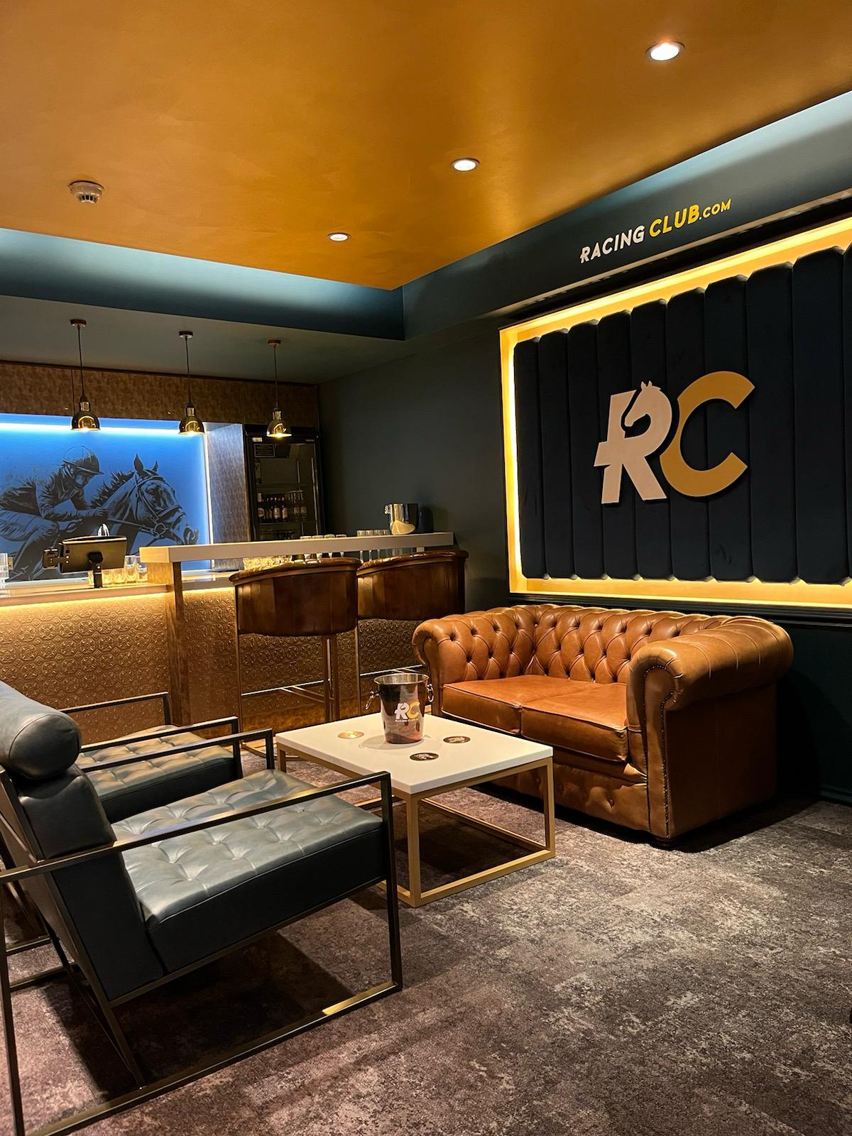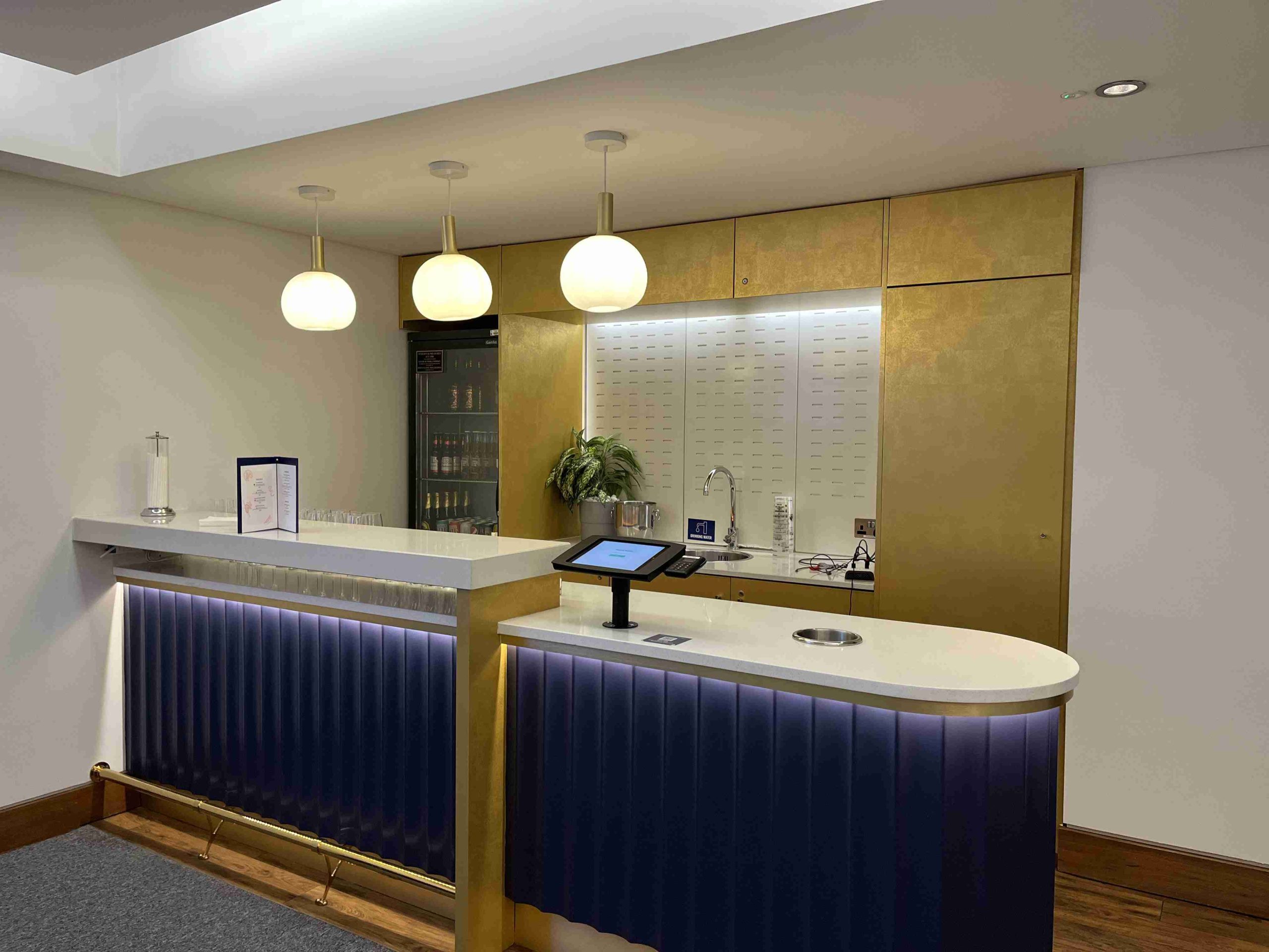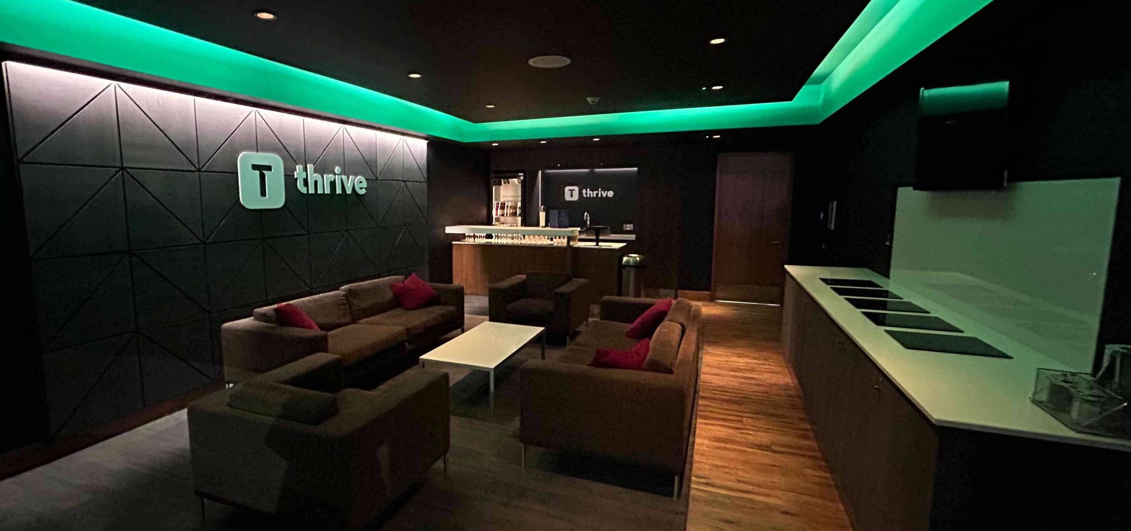 This project was completed for Thrive Suite, a wellness and lifestyle brand, as part of their O2 Arena VIP lounge. The interior was upgraded with black-painted walls and ceiling details, enhanced by green light accents. The bar received a black marble vinyl fascia, black stained wood finishes, and a splash back with a removable Thrive logo. Bespoke furniture in green velvet and black metal poseur tables complemented the modern aesthetic, while a decorative feature wall with integrated lighting and textured black stained wood completed the cohesive design.