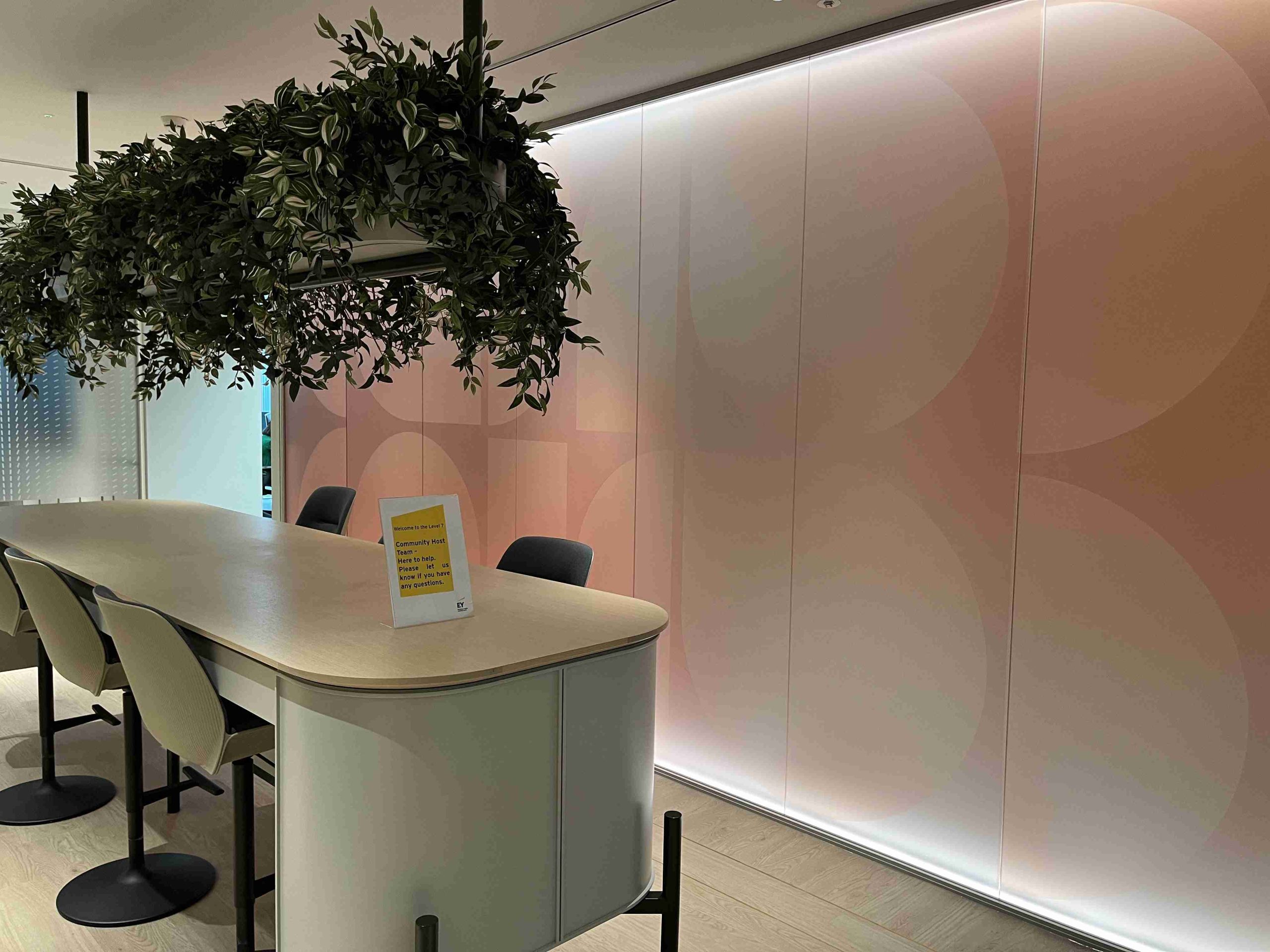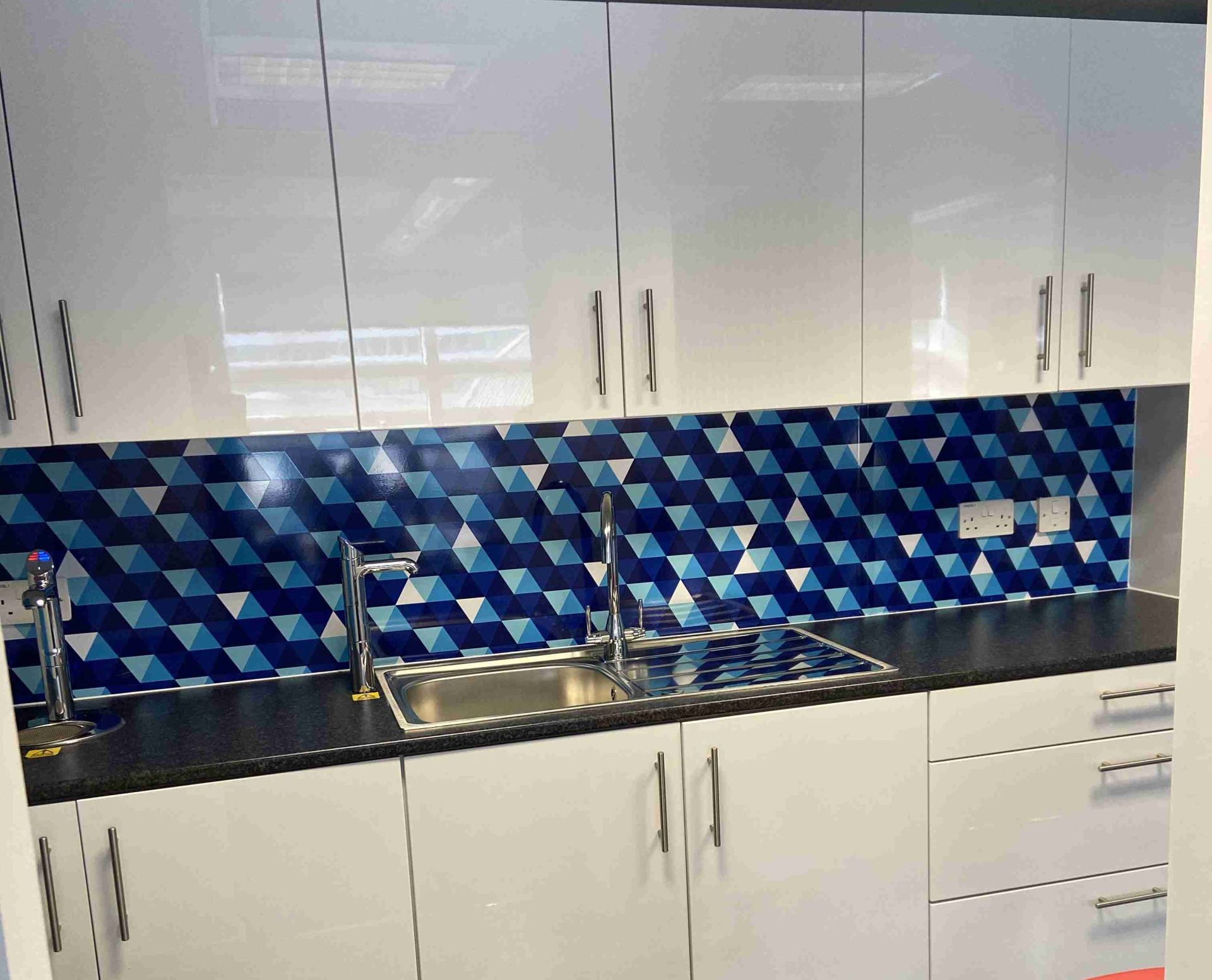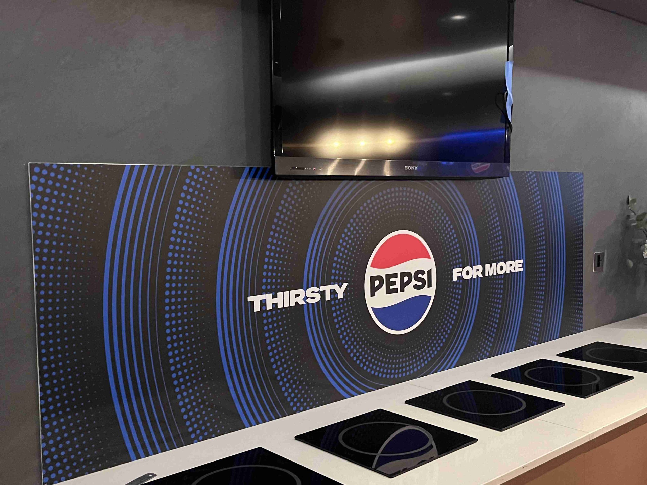 We used four colour print on an optically clear material, which we then applied to glass. The walls are printed cut vinyl. To meet the exacting specifications, we used specialist colour correction software.